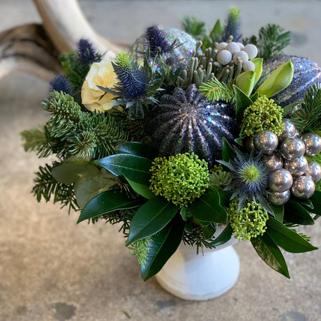 The photo represents the color palette and style. While your arrangement will be similar, each piece is uniquely designed with its own distinctive character