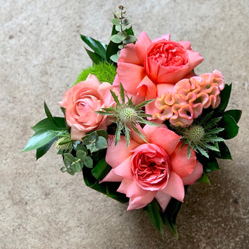 A sweet medley of pink roses, peachy ranunculus, green mossy ball dianthus with touch of silver thistle are tastefully arranged in a glass vase.