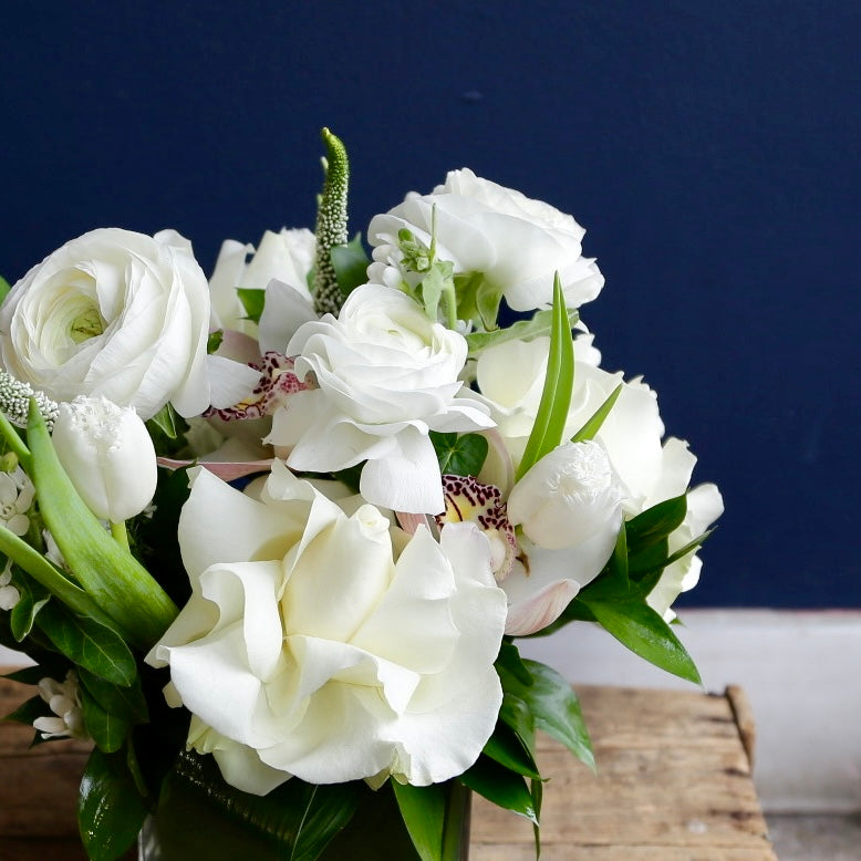 Indulge in the pure elegance of our "Thinking of You" flower arrangement. This stunning display of fresh, white blooms exudes sophistication and luxury. Perfect for sending a meaningful message to a loved one or brightening up any space with a touch of refinement.